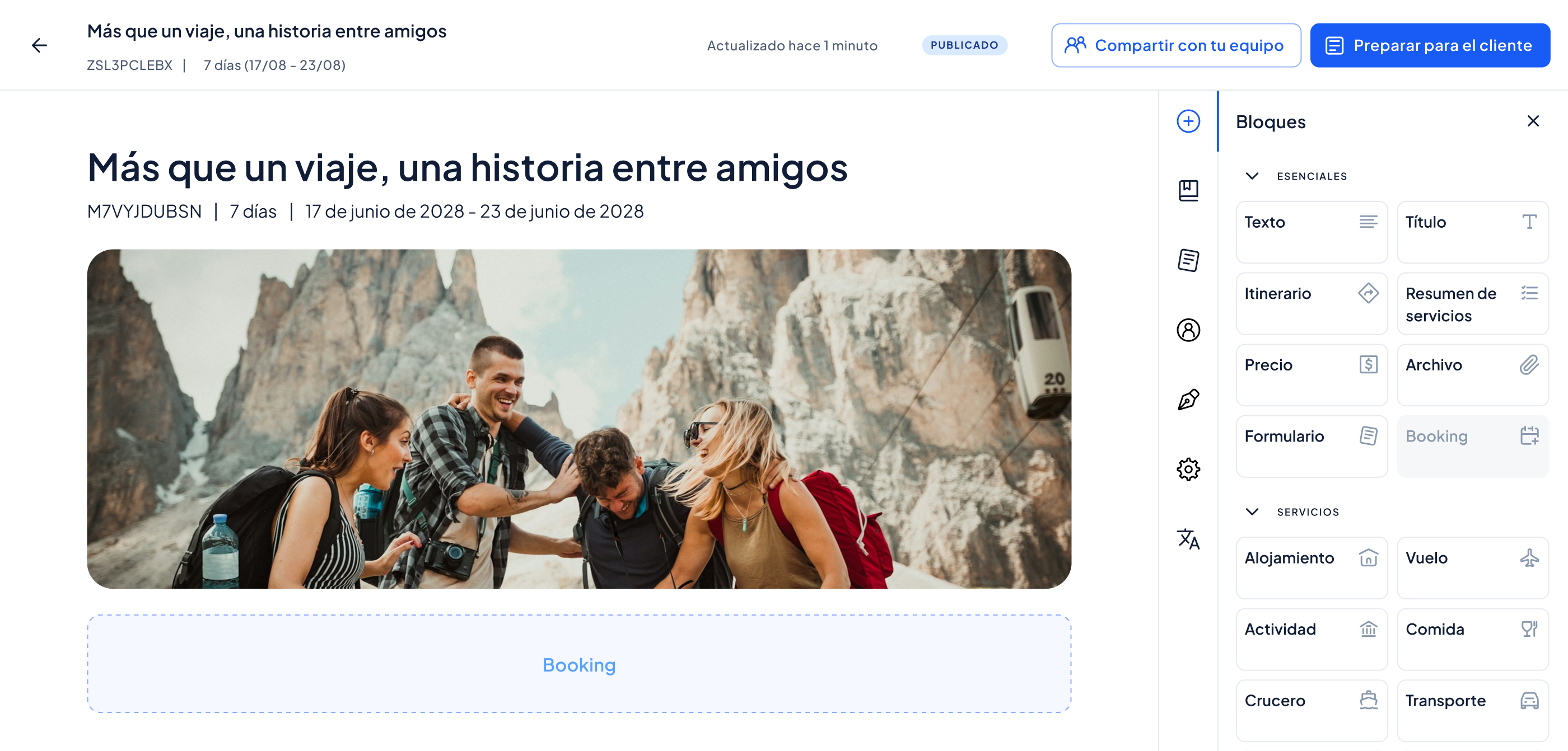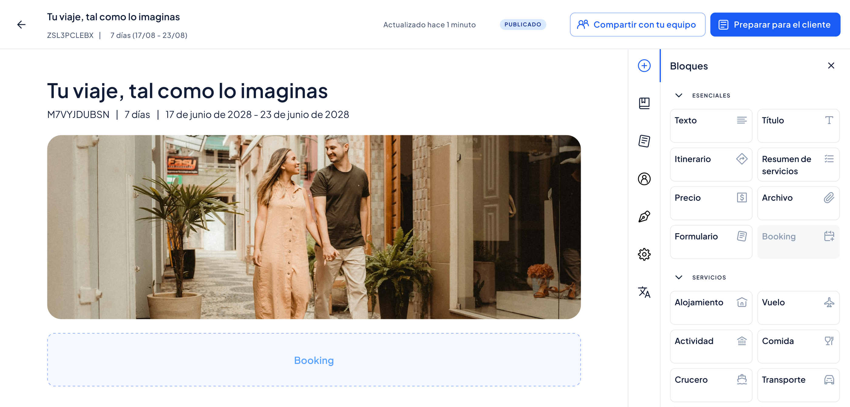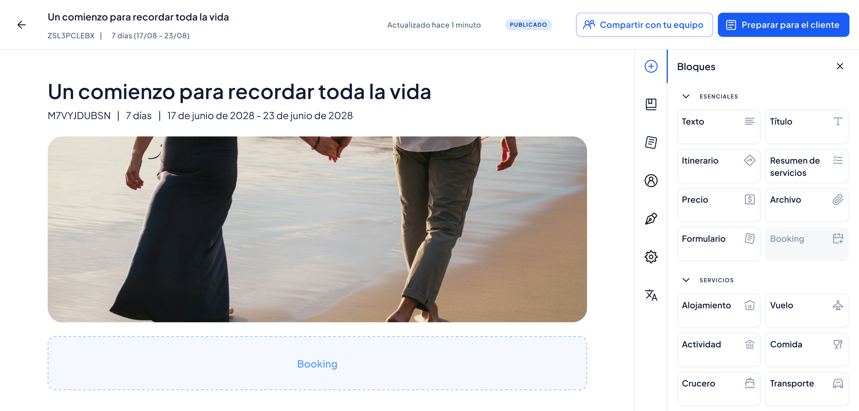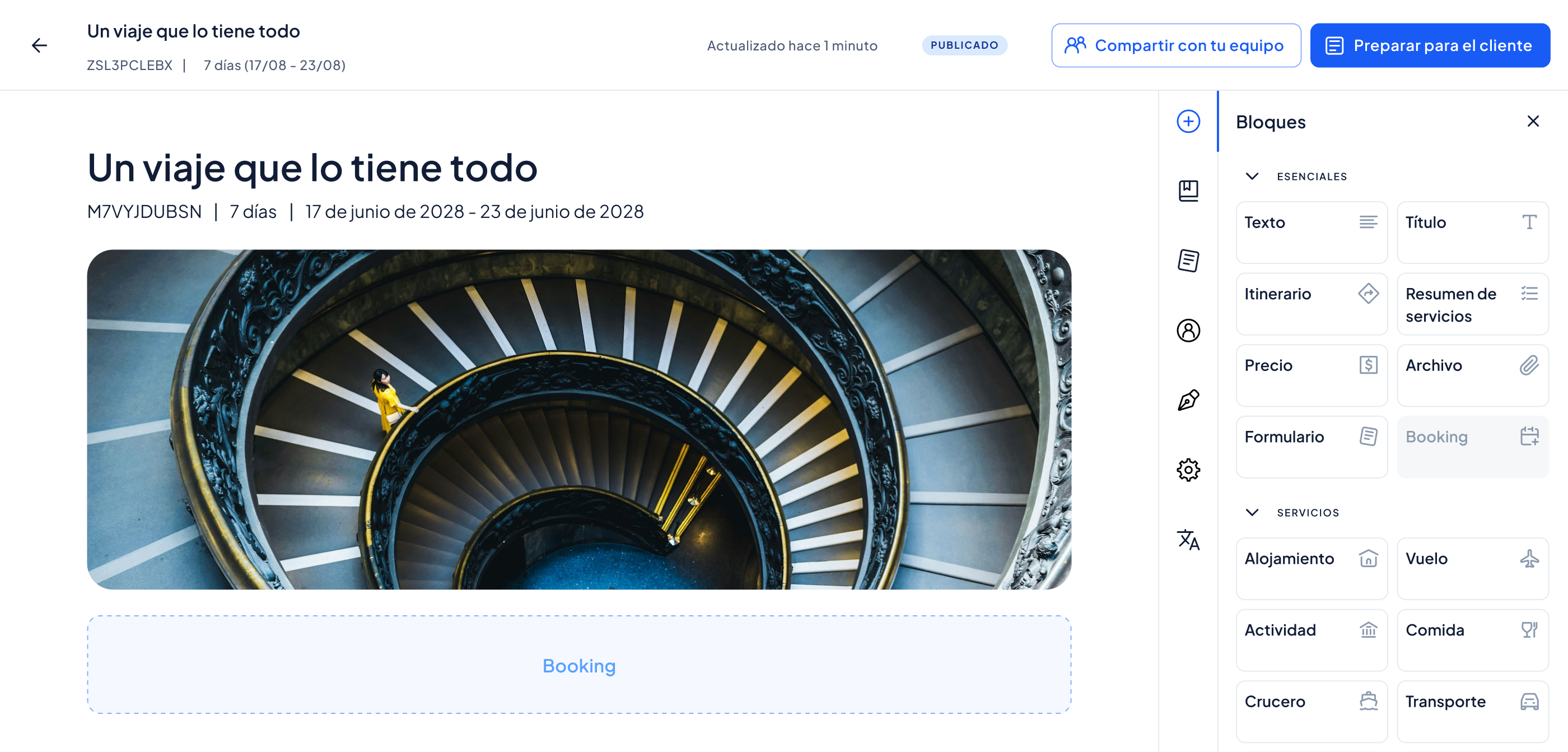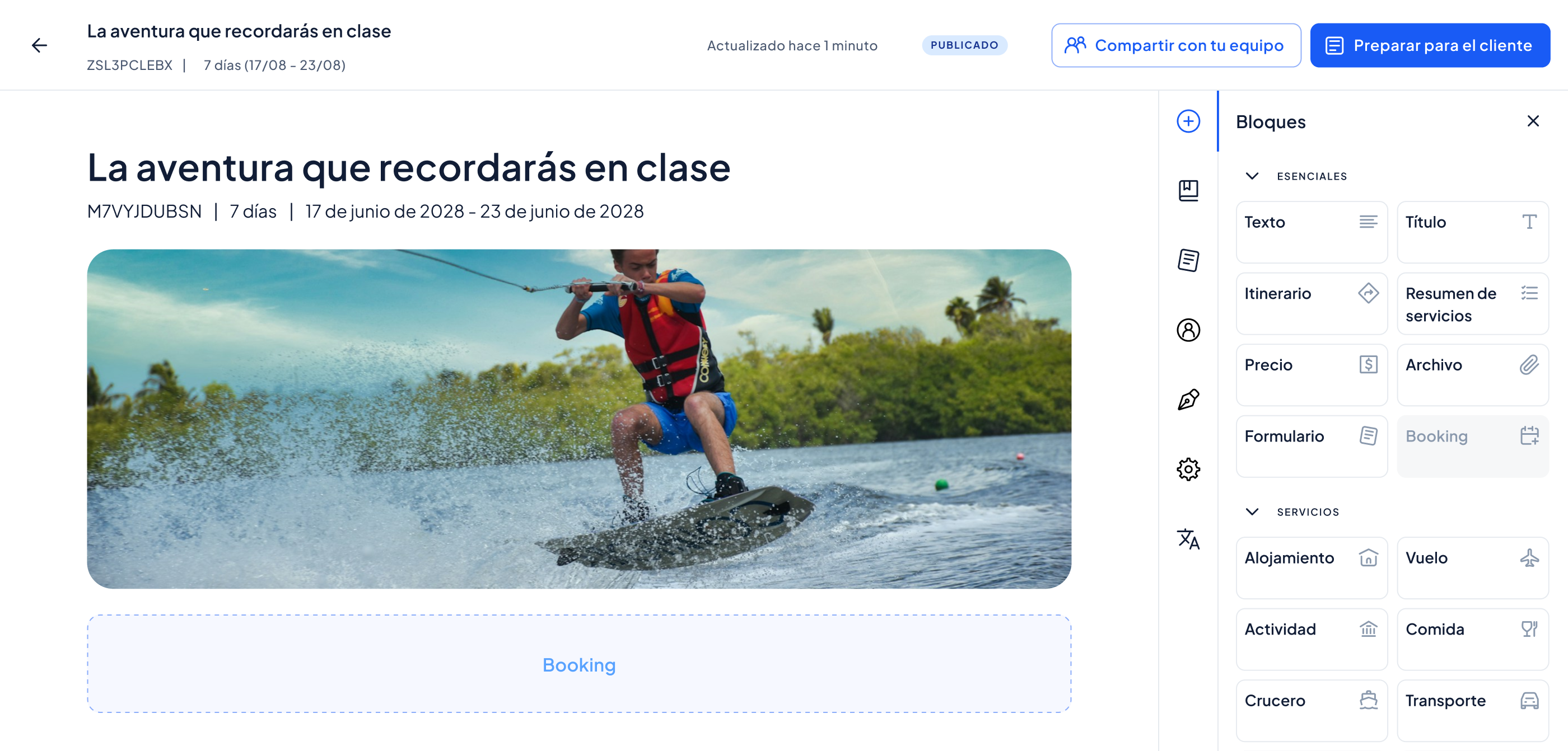 ¿Cuántas veces has escrito la misma descripción de hotel? Guarda destinos, hoteles y actividades como bloques reutilizables y crea nuevas propuestas en minutos. Cada viaje es único, el trabajo no tiene por qué repetirse.