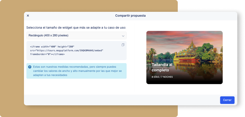 Para hacerlo, simplemente tienes que pinchar, dentro del menú de la propuesta, donde pone “compartir”. Ahí podrás seleccionar cómo quieres que se vea la tarjeta: cuadrada, rectangular o vertical. Ya solo tendrás que copiar el código que te aparece y pegarlo en tu web sobre una etiqueta HTML. Tu propuesta quedará así enlazada con tu web, y lo mejor es que, como todo en MOGU, es completamente dinámica: todos los cambios que hagas se reflejarán en el enlace que has compartido, de forma que el itinerario estará siempre actualizado al 100%.