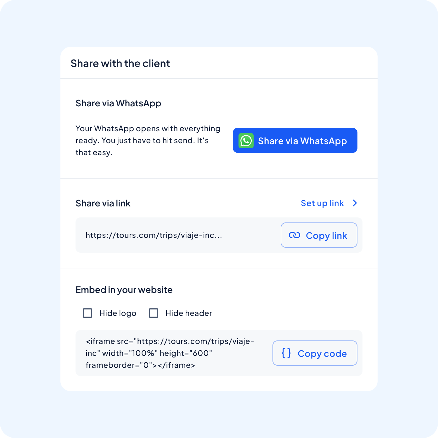 All travel itineraries you create in MOGU can be easily integrated into your website. Set up the view, copy the code, and share your trips with clients in minutes, always updated and accessible from any device.