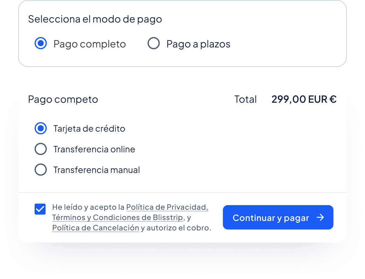 Da más flexibilidad a tus clientes dividiendo el coste total del viaje en pagos programados, manteniendo el control total de cada reserva.
